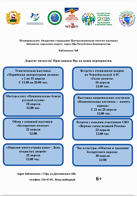 С 1 по 18 апреля - Дни марийской культуры и литературы 23 апреля - Литературный час «Тукай в наших сердцах» С 21 по 25 апреля - Тематическая выставка «Белорусское полесье» С 16 по 18 апреля - Книжная выставка «Красота удмуртской литературы» С 21 по 26 апреля - Тематическая выставка «Белорусское полесье»