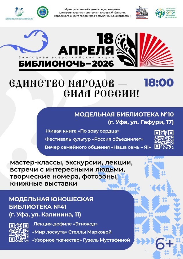 | Приглашаем жителей и гостей Уфы присоединиться к Всероссийской акции «Библионочь‑2026», которая пройдёт под девизом «Единство народов — сила России!».