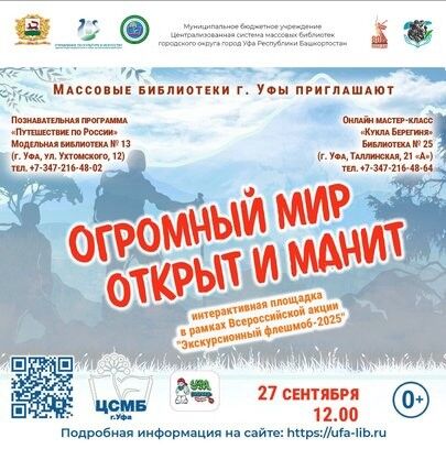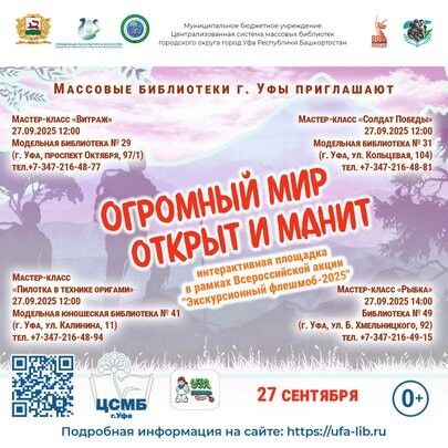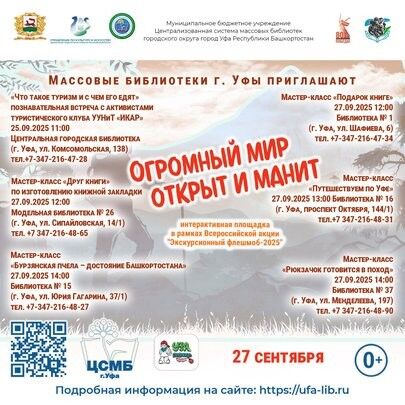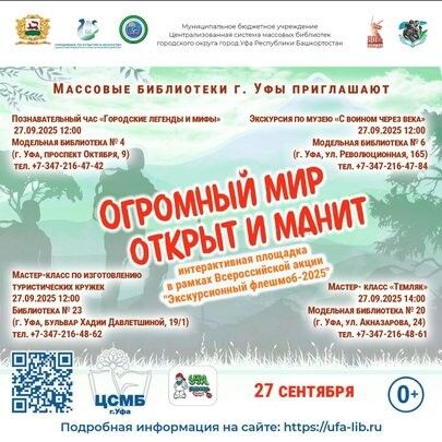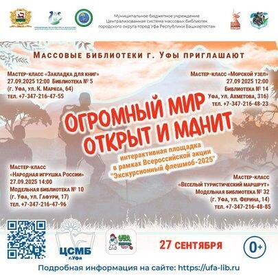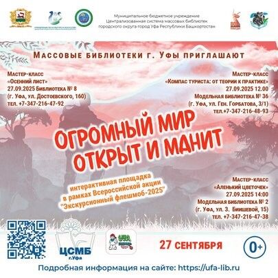 Экскурсионный флешмоб-2025 в массовых библиотеках Уфы 27 сентября 2025 года в 12:00 массовые библиотеки Уфы приглашают вас стать частью грандиозного события — ежегодной Всероссийской акции «Экскурсионный флешмоб-2025»! Организатор акции — Туристский информационный центр Омской области. Цель акции - помочь каждому открыть для себя родной город с новой, неизведанной стороны. Погрузиться в его богатую историю, прикоснуться к культурному наследию и современным достижениям. Ведь невозможно по-настоящему развиваться, не любя и не зная места, где живёшь! Масштабное событие объединит всех участников в едином порыве познания и открытий. Что вас ждёт? В 12:00 по местному времени в городах России и СНГ одновременно стартуют: