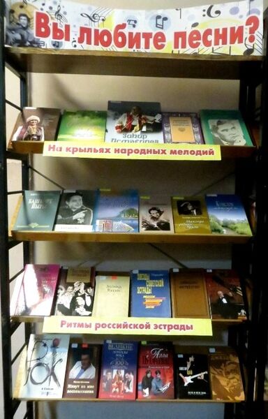 8 августа в Информационно-досуговом зале библиотеки была организована выставка-представление «Вы любите песни?», где были представлены музыкальные альбомы и пластинки легендарных артистов советского времени. Прикосновение к музыке через литературу является одним из способов привлечь внимание читателей к историческому достоянию народа. Она предполагает не только воспитание уважения к уникальности традиций, но и поощрение самоопределения и патриотизма, любви к родной культуре. Интересные факты из истории башкирской музыки: Особенности башкирской музыки: одноголосность. Разновидности: узун-кюй (долгий, протяжный напев, включающий широкораспевные метроритмически свободные песни или инструментальные мелодии импровизационного склада), уртаса-кюй (полупротяжный напев), кыска-кюй (короткий напев, включающий скорые, чёткие по структуре ритмические моторные песни или изобразительные пьесы). К кыска-кюй примыкают различные виды инструментальных мелодий: марши, сопровождающие военные мужские танцы; кыланып-бейеу — мелодии, связанные с героическими танцами; бейеу-кюй — лирические и плясовые напевы; такмак — плясовая песня типа частушки. Композитор Г. Свиридов, живший во время Великой Отечественной Войны в Башкортостане (г. Бирск) считал, что башкирская музыка в корне отличается от музыки всех тюркских и восточных народов и наиболее близка по своей природе к пентатонике кельтских народов. Ф. Шаляпин дебютировал 18 декабря 1890 года в Уфе в здании зимнего театра в сольной партии оперного спектакля С. Монюшко «Галька» спектакли труппы С. Я. Семенова-Самарского. В Уфе состоялась его первая сольная партия, первый бенефис, первый автограф, первые уроки вокала. В сентябре 1964 года в Уфе проходила Неделя башкирской музыки. В Уфу приезжали члены секретариата Союза композиторов РСФСР включая Д. Д. Шостаковича. По окончании смотра Д. Д. Шостакович сказал, что «… высокий уровень творчества башкирских композиторов очень порадовал. В то же время хочется сделать ряд критических замечаний. Башкирские композиторы еще мало создали произведений о нашем рабочем классе. Воспеть его будни, его замечательные трудовые достижения, его подвиги — их первейшая обязанность, и я уверен, что они эту обязанность в скором времени выполнят». Судя по нашей книжной выставке, с уверенностью можно будет сказать, что наши композиторы эту обязанность выполнили!