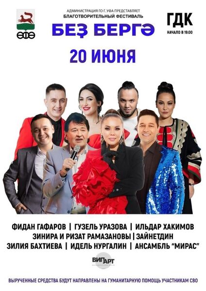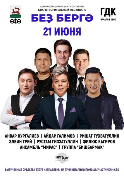 В Уфе пройдет благотворительный фестиваль «Без Бергэ!» - «Мы вместе, Мы едины!»20 и 21 июня 2023 года на сцене Городского Дворца культуры при поддержке Администрации городского округа город Уфа пройдет грандиозный благотворительный фестиваль «Без Бергэ!» - «Мы вместе, Мы едины!». Приобрести билеты можно здесь: https://iframeabpre1822.intickets.ru/seance/13649137 |