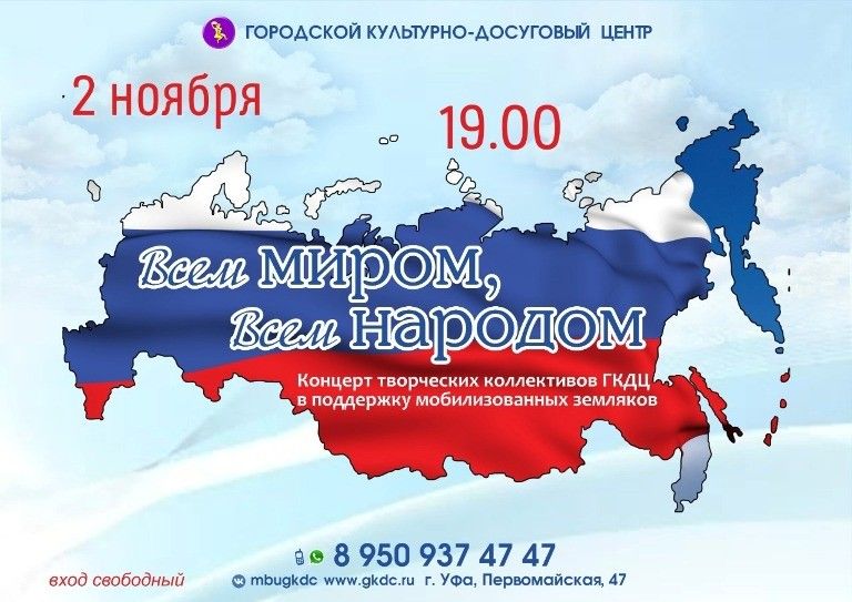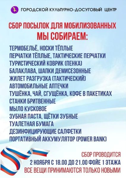 Уважаемые читатели! 2 ноября 2022 года в Городском культурно-досуговом центре состоится мероприятие, направленное на поддержку мобилизованных граждан Республики Башкортостан. В его рамках пройдет благотворительная акция по сбору необходимых предметов одежды, личной гигиены и продуктовых наборов. С 18.00 до 21.00 ч. в центральном фойе ГКДЦ волонтеры и сотрудники центра будут осуществлять прием гуманитарной помощи от населения согласно установленному перечню. Принять в участие в Акции сможет любой желающий. Все собранные вещи, продукты питания и предметы личной гигиены будут направлены мобилизованным гражданам. В 19.00 ч. начнется концерт творческих коллективов Центра. Вход для зрителей свободный. |