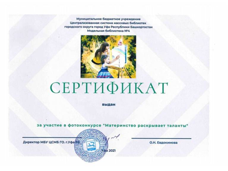 Уважаемые читатели! МБУ Централизованной системы массовых библиотек ГО г. Уфа РБ. На фотоработах изображены мамы, позиционирующие свои творческие и художественные способности. 1 место – Арслангазина Гульфия - город Уфа Республика Башкортостан 2 место – Золотарева Елена - город Уфа Республика Башкортостан 3 место – Николаева Анастасия - город Уфа Республика Башкортостан Итоги конкурса размещены на официальном сайте https://8.ufa-lib.ru и на официальной странице библиотеки-организатора в социальных сетях ВКонтакте https://vk.com/bibl_spektr Победители конкурса будут награждены электронными оригинальными именными дипломами. Все участники станут обладателями электронного сертификата Благодарим всех, кто принял участие в нашем конкурсе, до новых встреч!! |